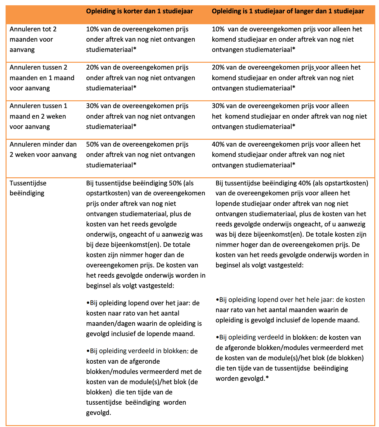 Betaling in termijnen is mogelijk voor cursussen vanaf €1.000. De termijnen worden verdeeld in twee gelijke delen: één voor aanvang van het programma en één halverwege de cursus.