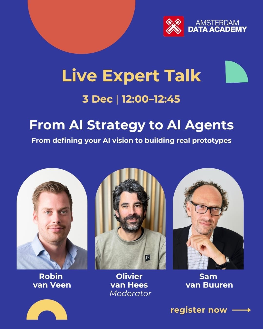 Gemodereerd door Olivier van Hees, Sam van Buuren en Robin van Veen zal laten zien hoe je van het definiëren van een AI-visie om echte, werkende AI-oplossingen - en je vragen live beantwoorden.